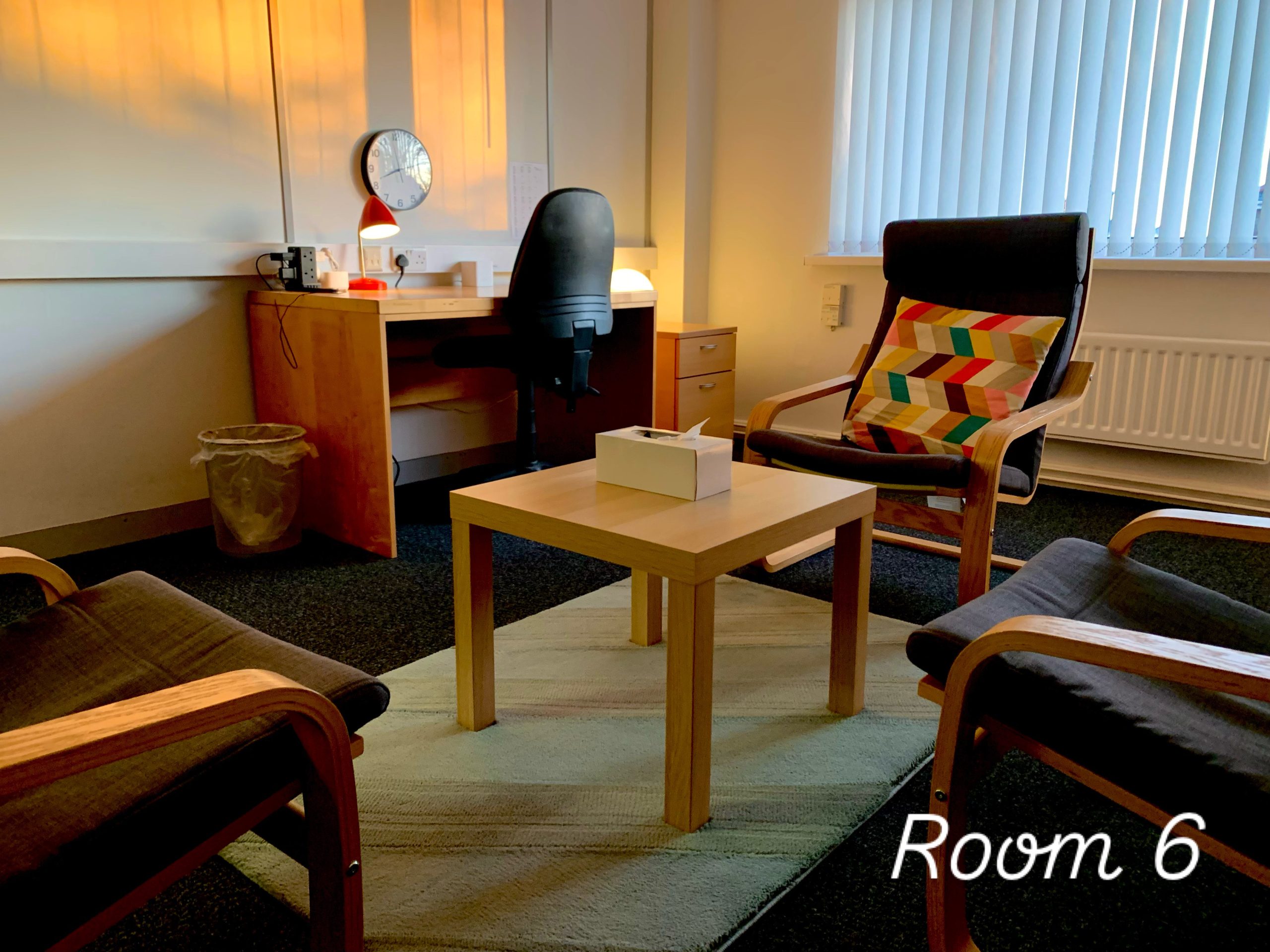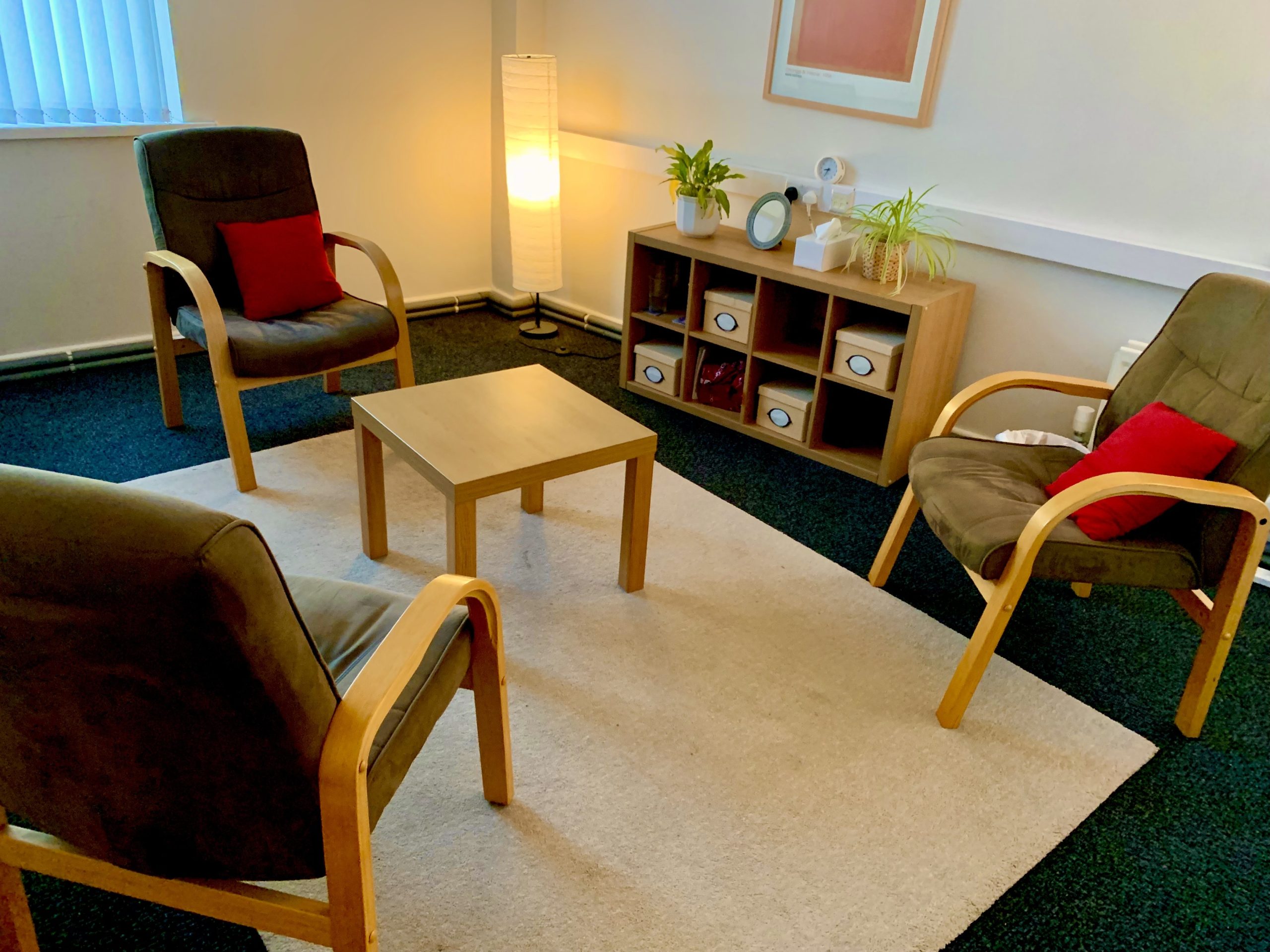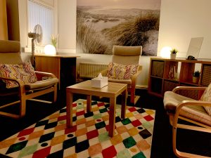 The rooms are suitable for individual and couples work, each with 3 comfortable chairs. One of our rooms(5) is big enough for small group work. Each room has a desk and chair and good Wi-Fi. We offer weekly regular time slots which you can back up with an ad hoc booking service. Also included when you join us is a profile page here on our website and a referral system via the general enquiries email and phone number.